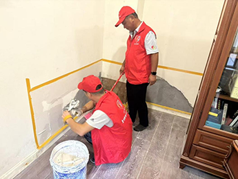 复地香栀花园小区某栋居民胡女士通过社区网格员找到第一工程公司桃浦项目负责人,希望能解决她家墙面受损的问题。经了解,胡女士家因年久失修,墙面腻子出现大面积发霉、空鼓和渗水脱落现象。第一志愿分队先将斑驳、空鼓的墙面表皮彻底铲除,然后对墙面裂缝进行填补、打磨平整,经过两天紧张作业,胡女士家内部修缮工作顺利完成,解决了困扰她家多年的难题。