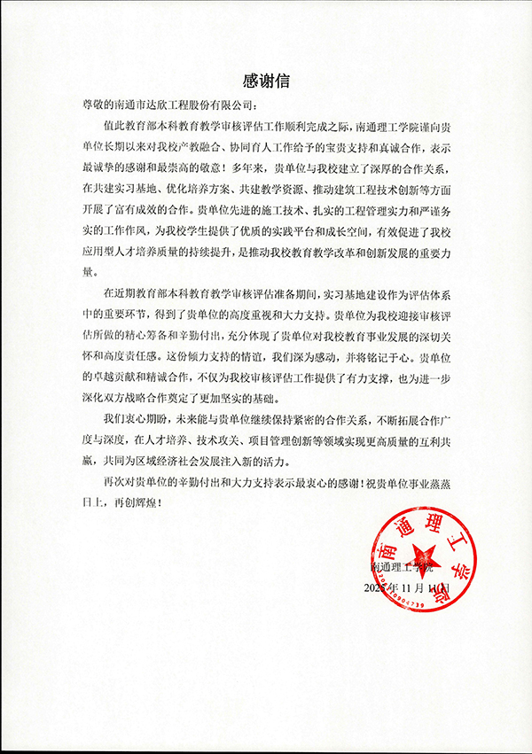 集团近日收到南通理工学院的感谢信,对其在本科教育教学审核评估中的大力支持表示诚挚感谢。