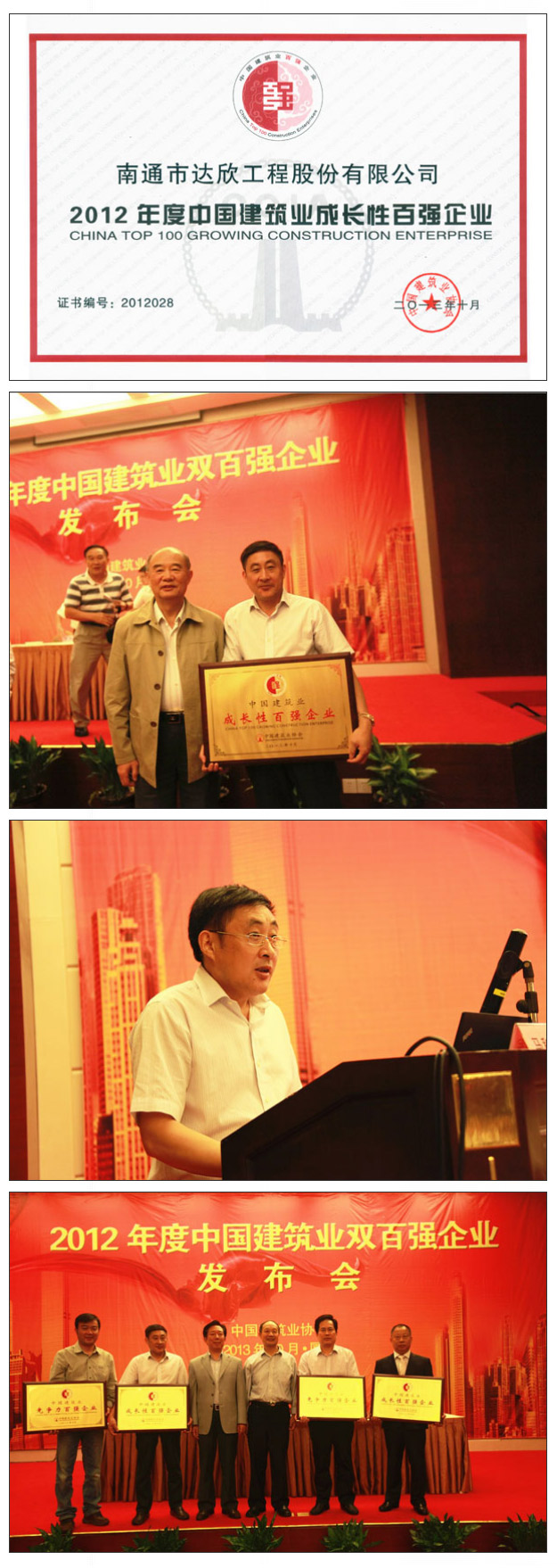 会议发布了2012年度中国建筑业双百强企业,爱游戏ayx首页再次入选成长性百强企业(综合排名位列第28名,比去年排名提高了21位);会议向2012年度中国建筑业双百强企业颁发牌证,我公司作为获奖企业代表上台领取奖牌;会议还同时进行了中国建筑业双百强企业代表经验交流,公司董事长马和军作为江苏地区代表、作为成长性百强企业代表在会上作了“砥砺奋进,拼搏进取,实现企业新跨越”的经验交流。