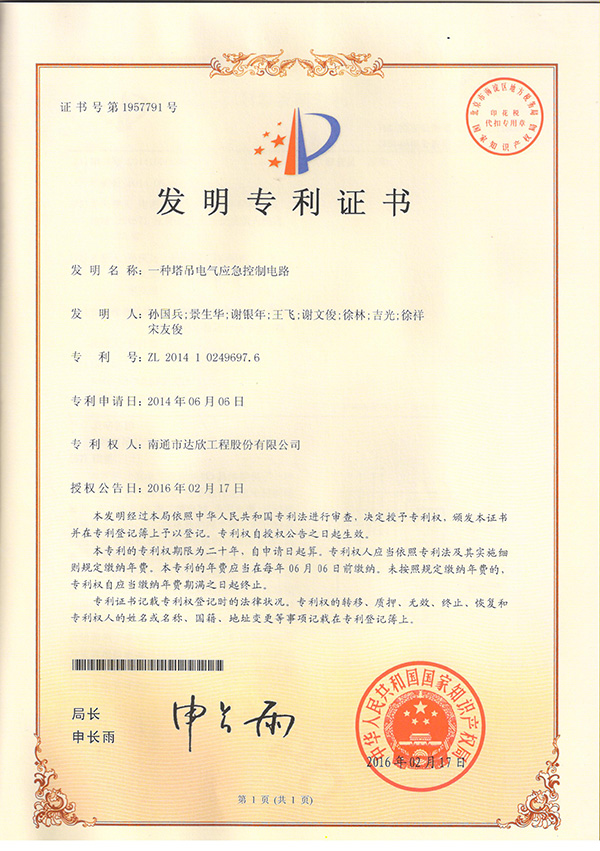 【另 讯】:由第五工程公司2014年6月申报的《一种塔吊电气应急控制电路》,于2016年2月17日获得国家知识产权局授权的发明专利证书。