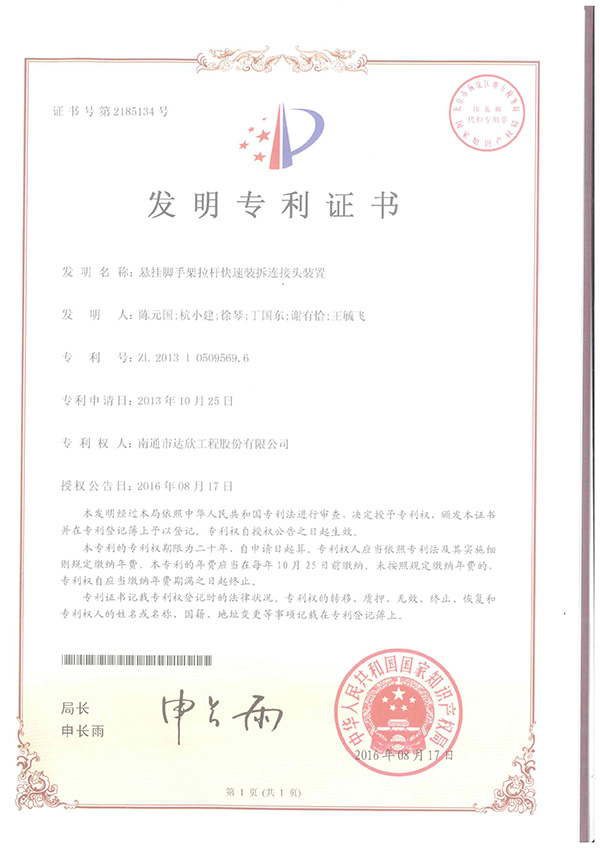 由第一工程公司申报的《悬挂脚手架拉杆快速装拆连接头装置》成功获国家知识产权局授权,于2016年8月17日获得国家发明专利证书。该发明专利系工程公司《无揽风绳独立桅杆吊装劲性钢柱专用夹具》后又一国家发明专利。
