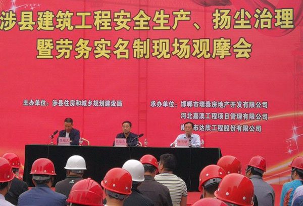 住建局局长张玉斌对我公司在御湖天城建筑安全施工、扬尘整治暨劳务实名制的做法,给予高度肯定。 他表示,我们公司在安全管理、扬尘治理及劳务实名制的做法为涉县其他各单位的现场安全管理、扬尘治理及有效地维护农民工权益指明了方向和途径。
