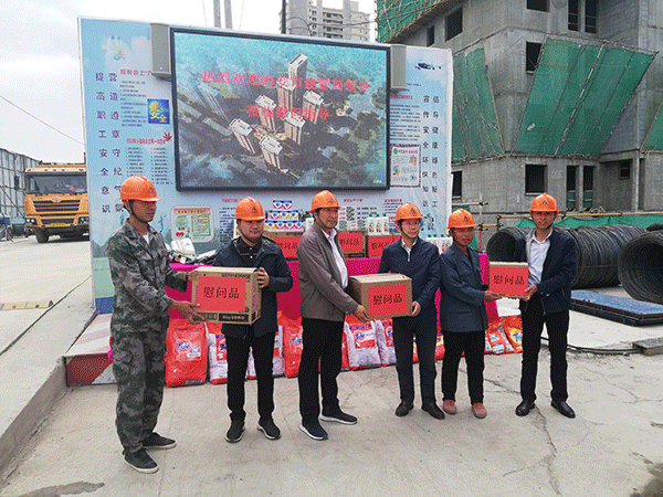工程公司指导员徐修同对贾局长一行的到来表示热烈的欢迎。随后,贾局长一行参观了项目施工现场,徐修同就君豪项目做了简单介绍。贾局长对施工现场各项工作的有序开展表示充分肯定,同时叮嘱项目管理人员不仅要保证工程质量、安全和进度,还要切实保障建筑工人的合法权益,关心建筑工人的工作与生活。最后贾局长一行将慰问品发放到工人的手中。