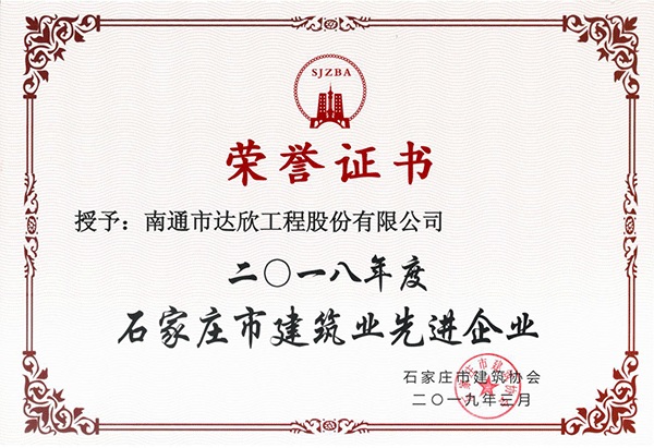 我司被石家庄市建筑协会评为“2018年度石家庄市建筑业先进企业”同时,杨静同志评为“2018年度石家庄市建筑业优秀企业经理”,刘红强同志被评为“2018年度石家庄市建筑业优秀项目经理”,被河北省建筑业协会评为“2018年度河北省建筑业先进企业”、“河北省建筑业AAA级社会诚信企业”,这是我司连续多次获此殊荣;同时,徐仁忠、杨静同志被评为“2018年度河北省建筑业优秀企业管理者”,傅海荣同志被评为“2018年度河北省建筑业优秀总工程师”。