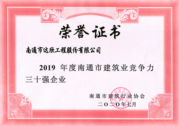 根据《关于开展2019年度南通市建筑业“双三十强”及“三优”评价工作的通知》(通建协〔2020〕2号),经评审委员会对“双三十强”企业及“三优”初审结果进行复核、审查,最终公司获得2019年度南通市建筑业竞争力三十强企业,评价排名第11位,马和军同志获得南通市建筑业优秀企业家,杨静同志获得南通市建筑业优秀企业经理。