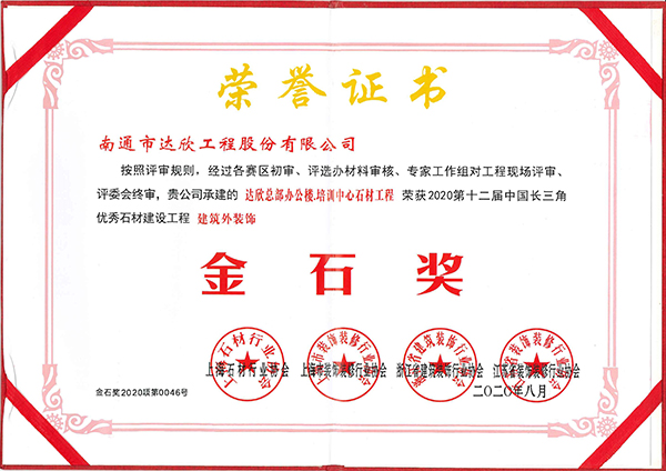 中国长三角石材建设工程“金石奖”是石材工程领域的奥斯卡金奖,爱游戏ayx首页总部办公楼培训中心获此殊荣是对该项目完美品质和公司实力的充分肯定。我们将以此为动力,继续打造更多精品工程,为爱游戏ayx首页的发展增光添彩。