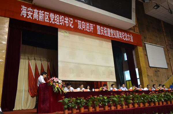6月27日,海安高新区党组织书记“双向述评”暨庆祝建党91周年大会在我县海中体艺馆举行。县委常委、海安高新区党工委书记张亚曦及全体党政负责人、各局(办)、各街、村(居)全体人员、各党(总)支部书记、全体县、镇党代表参加了会议。