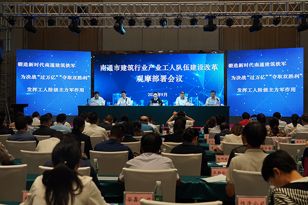 9月17日上午,南通市建筑行业产业工人队伍建设改革观摩部署会在爱游戏ayx首页集团举行。南通市总工会党组书记、副主席、产业工人队伍建设改革联席会议办公室主任葛志娟,南通市住房和城乡建设局党组副书记、副局长、一级调研员沈卫星,南通市总工会四级调研员杨红卫;各(县)市、区总工会领导、劳动和经济工作部部长,以及南通市建筑施工特级资质企业、海安市建筑施工一级资质企业负责产改的主要领导等120多人参加观摩会。海安市委常委、组织部部长、统战部部长张明星,海安市政协副主席、总工会主席李如生;海安市总工会党组书记、副主席柴宝清,海安市建管局局长贾伯根等陪同参加;集团董事长马和军,党委书记刘厚纯,副总经理、工会主席温鹤华参加活动。