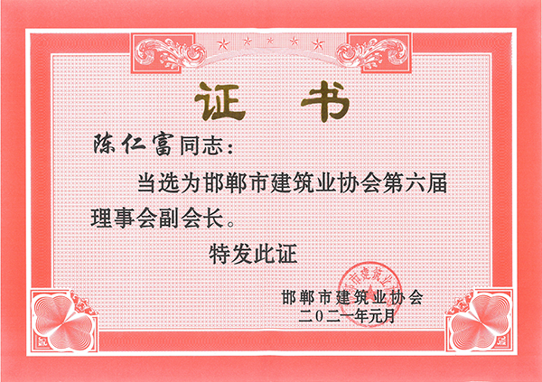 2021年1月8日,邯郸市建筑业协会第六届会员大会第二次会议在邯郸市举行。会上,第三工程公司总经理陈仁富当选为邯郸市建筑业协会第六届理事会副会长。