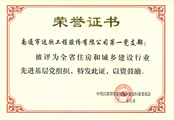 近日,第一党支部被中共江苏省住房和城乡建设行业委员评为“全省住建行业先进基层党组织”称号,同时也是江苏出省建筑单位进沪唯一一家获得此荣誉的先进党组织。