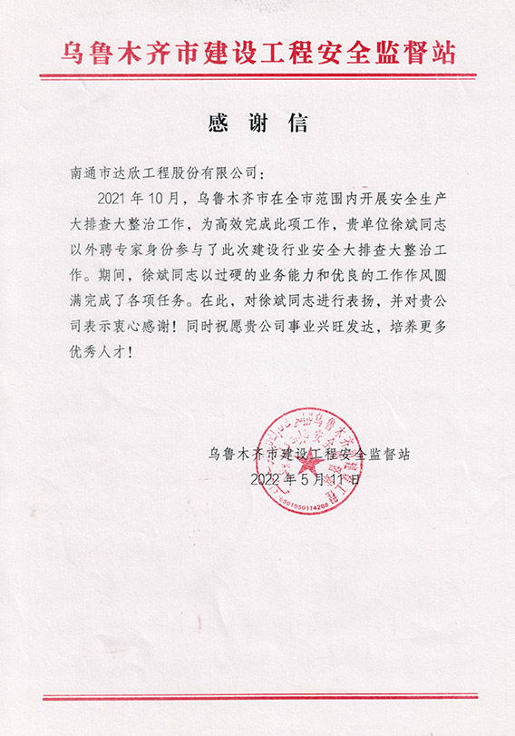 6月8日,集团收到一封来自乌鲁木齐市建设工程安全监督站的感谢信,详细内容如下: