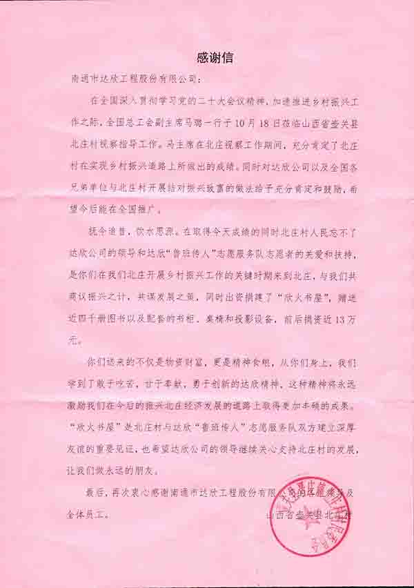 元月9日,公司收到来自山西省壶关县北庄村村委会党支部寄来的锦旗和感谢信,对集团在助力北庄村乡村建设、乡村振兴、乡村致富等方面所给予的关爱和扶持表示感谢。