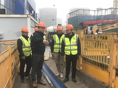 在听取项目负责人简单的汇报后,杭书记深入施工一线,对项目现场进行了巡视,查看了项目建设进度、安全、质量、文明施工等情况,询问了建设过程中存在的问题和困难,并提出合理化意见和建议。他鼓励大家要齐心协力、克服当前暂时的困难,保持集团标杆项目的工作态度和打造精品的精神,继续打造观摩工地,树立品牌形象,早日向业主方交出满意答卷。