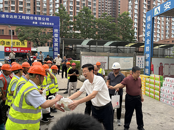 7月5日上午,邯郸市总工会主席李书平一行莅临江城首邑项目,对一线职工进行高温慰问与关怀。李主席向项目施工人员发放了毛巾、矿泉水、绿茶等防暑降温品,表达了党和政府对基层劳动者的关心与支持。