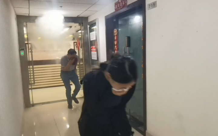现场从发现着火点、报警、疏散人员等情景开展模拟演练。随着火警警报的响起,在场人员立即按照预先制定的疏散方案行动。大家迅速采取“弯腰低头、捂鼻贴墙”的逃生姿势,在疏散过程中,大家保持冷静,有序地沿着疏散通道向室外撤离。
