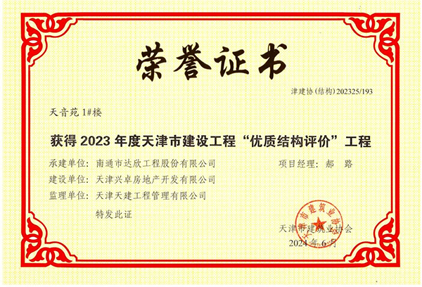 近日,由第六工程公司承建的天音苑1#楼荣获“2023年度天津市建设工程“优质结构评价”工程。
