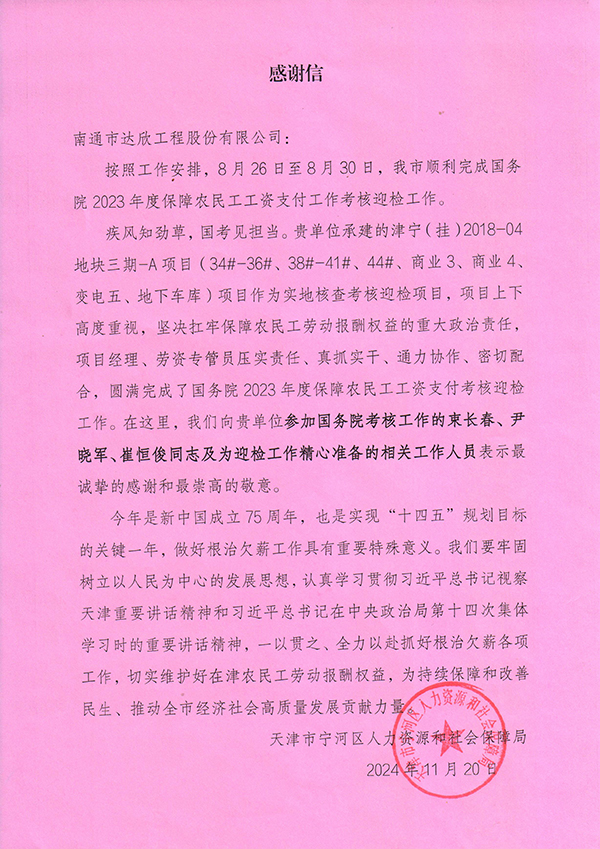 近日,第六工程公司承建的津宁(挂)2018-04地块项目三期工程代表天津市参加2023年度国家级省际交叉核查,在国务院针对省级根治欠薪工作整体情况的检查中成绩优异,荣获“标杆项目”荣誉称号,并对迎检过程中全体工作人员真抓实干、通力协作的精神表示感谢。