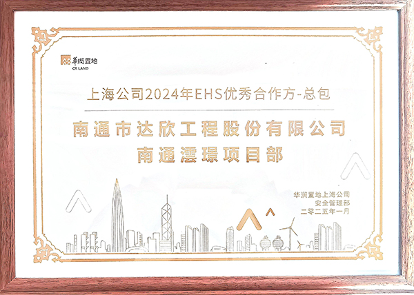 公司自与华润置地合作以来,凭借专业的能力、优质的服务和高效的协作,在众多合作方中脱颖而出,荣获华润置地上海公司“2024年EHS优秀合作方-总包”称号。
