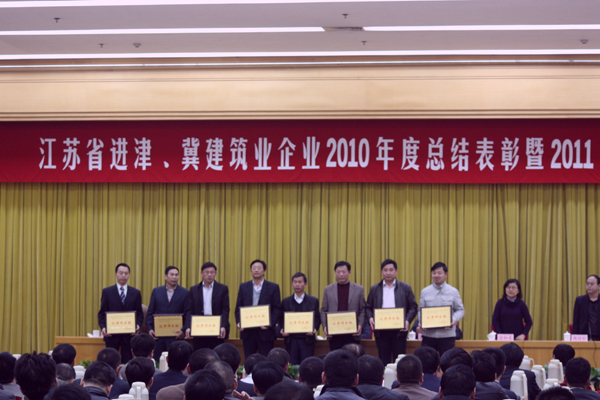 2011年3月20日,江苏省进津、冀建筑业企业2010年度总结表彰暨2011年工作大会在天津大礼堂隆重召开。大会由江苏省建设厅驻天津办事处副主任韩劲松主持,主任邓福林作了“抢抓新机遇,谋划新发展,不断开创江苏建筑业新局面”的工作报告,对2010年的工作进行回顾,并提出2011年工作目标任务。江苏省建筑工程管理局副局长纪迅、天津市外地施工队伍管理站站长吴海、江苏省住房和城乡建设厅监察室主任王毅、计划账务处调研员徐和美等江苏省、天津市的主管部门领导应邀出席了会议,纪迅局长、吴海站长作了重要讲话。