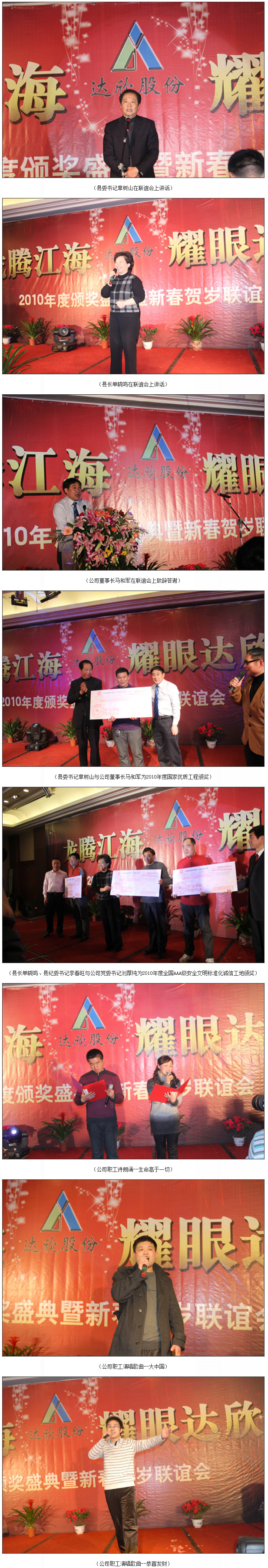 县委书记章树山与公司董事长马和军一同颁发了2010年度国家优质工程奖,县长单晓鸣、县纪委书记李春旺与公司党委书记刘厚纯一同颁发了2010年度全国AAA级安全文明标准化诚信工地奖项,常务县长王晓斌颁发了专利证书研制人谢果生奖项。现场还分别对国家级QC成果、新技术示范工程、3个先进项目部,优秀分包商、31名优秀管理人员等进行了颁奖。