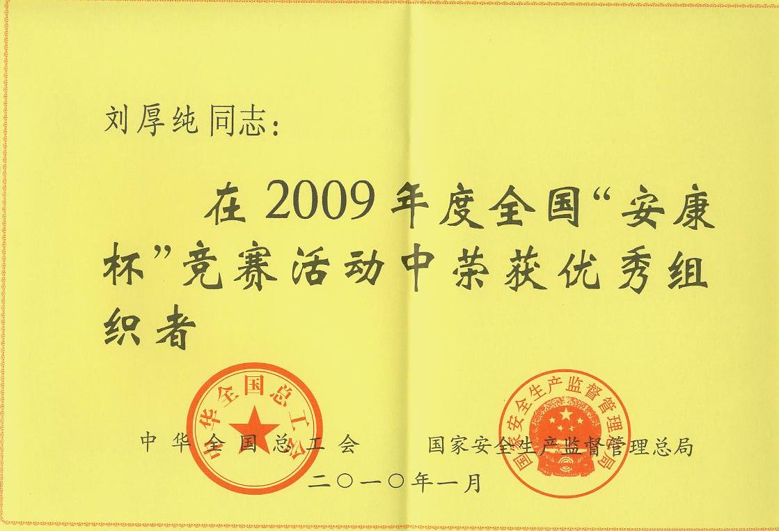 中华全国总工会、国家安全生产监督管理总局联合发文,公司党委书记、副董事长刘厚纯获得2009年度全国“安康杯”竞赛活动优秀组织者称号。