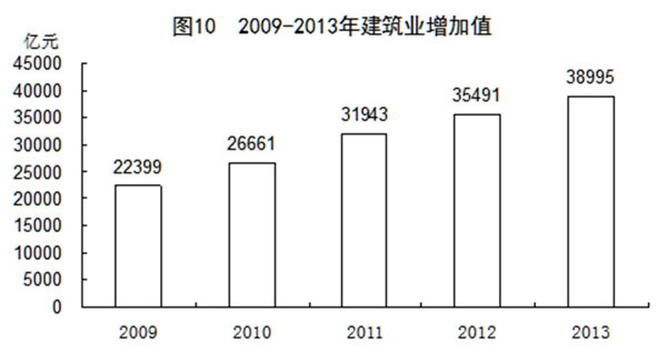 2013年全国建筑业增加值38995亿元,比上年增长9.5%。全国具有资质等级的总承包和专业承包建筑业企业实现利润5575亿元,增长16.7%,其中国有及国有控股企业1363亿元,增长20.1%。
