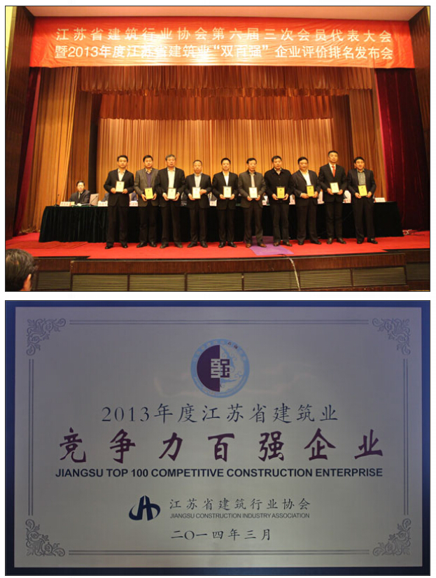 经评审委员会初审、统计、公示、核审,爱游戏ayx首页入选2013年度江苏建筑业企业竞争力百强,排名第35位,与2012年度相比,公司综合竞争力稳步提升,公司董事长马和军作为江苏建筑业优秀企业家代表上台领奖。江苏建筑业企业“双百强”评比是根据企业经营规模、资产规模、盈利能力、员工构成、科技进步、管理水平、精神文明等八个指标体系综合评比产生的,它代表了企业的综合竞争力水平。
