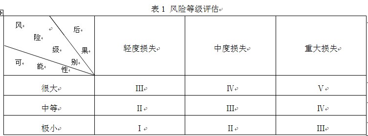 在对危险源识别的基础上,评估危险源造成风险可能性和大小,对风险进行分级,对不同等级风险采用相应的风险控制措施。风险等级评估:Ⅰ级为可忽略风险;Ⅱ级为可接受风险;Ⅲ级为中度风险;Ⅳ级为重大风险;Ⅴ级为不容许风险,如表1。