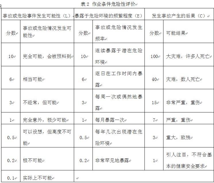风险等级评估通常采用“作业条件危险性评价法”,根据事故发生的可能性、暴露于危险环境的频繁程度和事故发生后的后果严重程度进行综合评分,来确定风险等级,如表2。