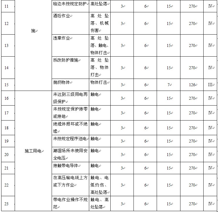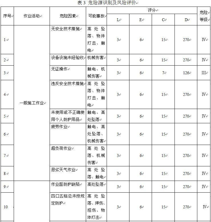 本公司目前在建的主要工程有:重庆直升机投资有限公司项目(包括总装厂房、交付中心和教学大楼),重庆机床集团搬迁项目(包括厂房、科技大楼、倒班宿舍)。公司针对两个施工现场特点进行分析,制订了危险源识别及风险评价表,部分内容如表3。