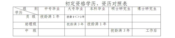 1、初定条件:大中专毕业生在所学专业与所从事工作的专业相同或相近的前提下,具备以下国家规定的相应学历、从事专业技术工作年限(表中简称“技龄”)的,可申请初定相应级别的专业技术资格: