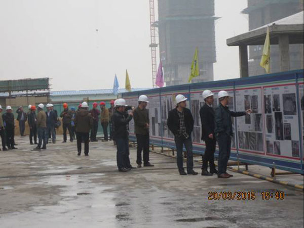 施工现场,项目经理崔益明就工程概况、文明工地创建采取的措施、质量管理方面新工艺、新材料革新以及采用样板引路所取得的成效向来访嘉宾作了详细介绍。考察嘉宾们一行先后参观了11#、12#地块现场文明施工、样板展示区、结构实体工程,对该项目部施工生产、安全质量、现场文明等方面给予了高度评价。苏州新湖置业王总表示希望在苏州区域保持良好持久合作的基础上,将积极推荐我司参与新湖中宝其他区域公司的项目合作。