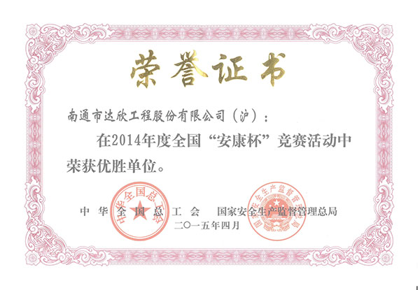 近日,第一工程公司被全国总工会和国家安全生产监督管理总局联合授予2014年度“全国‘安康杯’竞赛优胜单位”称号,这也是公司首次获此殊荣。