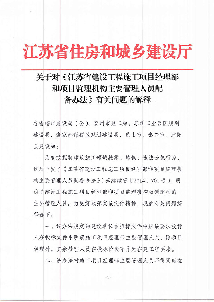 附件:关于对《江苏省建设工程施工项目经理部和项目监理机构主要管理人员配备办法》有关问题的解释