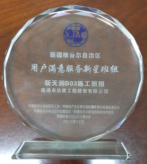 第十一工程公司新疆新天润B03项目部,凭借可靠的产品质量、较高的社会美誉度赢得了用户和业主的满意,通过了2015年度新疆维吾尔自治区总工会、中国共青团新疆维吾尔自治区委员会、新疆维吾尔自治区妇女联合会、新疆维吾尔自治区科学技术协会、新疆维吾尔自治区质量协会共同组织的专家组现场审核、答辩,成功获得了新疆维吾尔自治区全区、全行业竞争中建筑业唯一的“用户满意服务之星新星班组”的光荣称号(全区共获得12个新星班组),充分证明了我公司的综合实力和业界广大客户对我公司产品的认可。